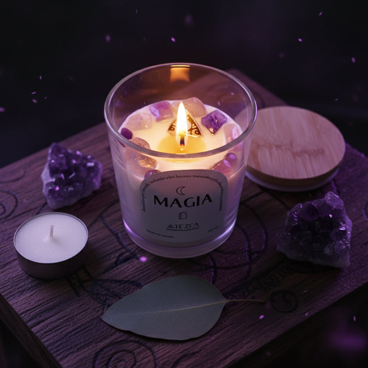 Esta vela te ayudará a decretar magia, encanto y buenos momentos en tu vida. Su aroma a Noche de verano te ayudará a ambientar tus espacios. Viene acompañada de cuarzos morados, pirita y un amuleto protector.